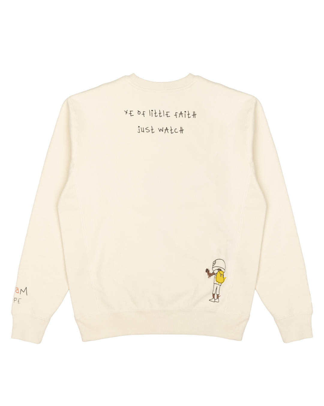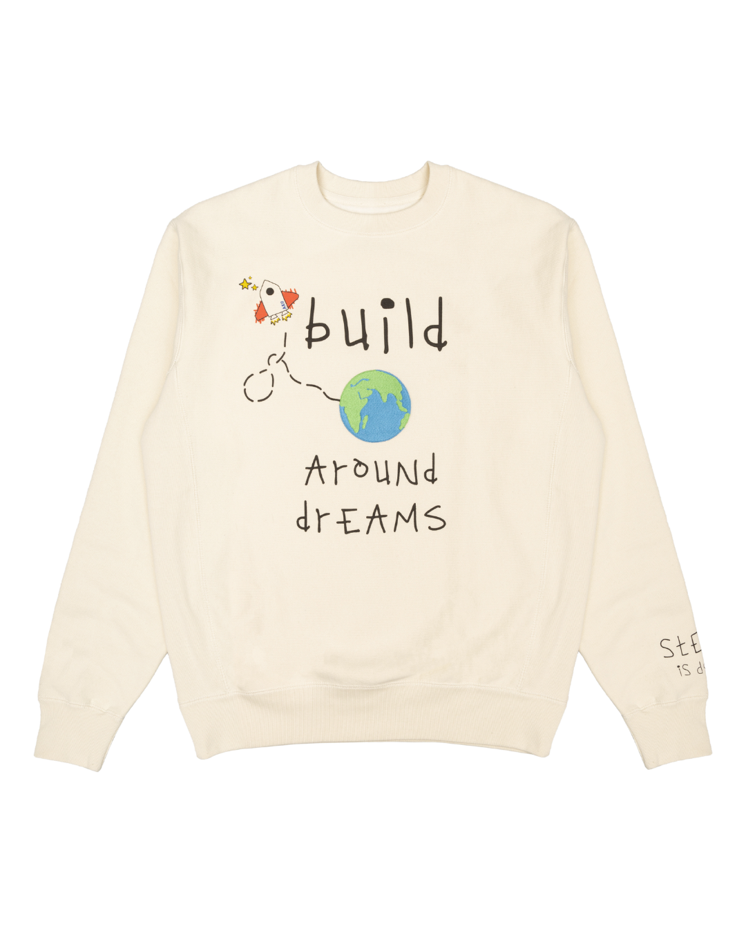 Inspired by the idea that we should not limited our dreams. This heavyweight crew features an embroidered earth, with handwritten reminders like “STEAM is dope” on the sleeve and “Ye of little faith, just watch” on the back.
